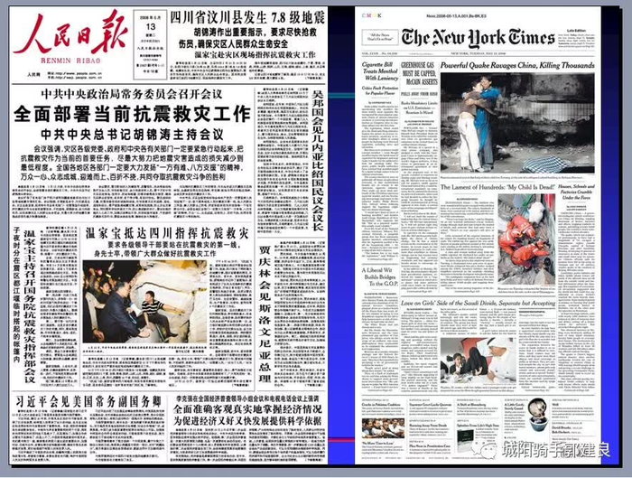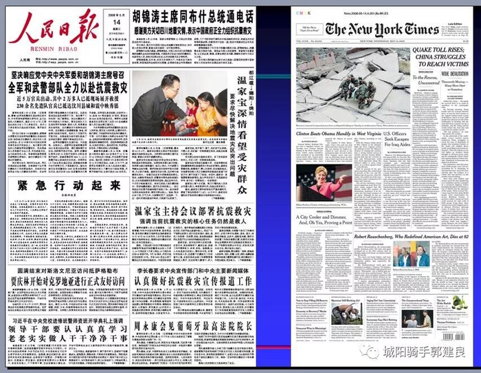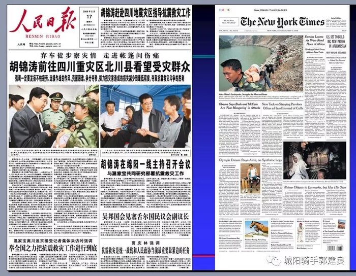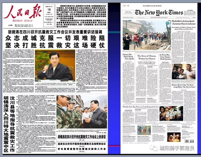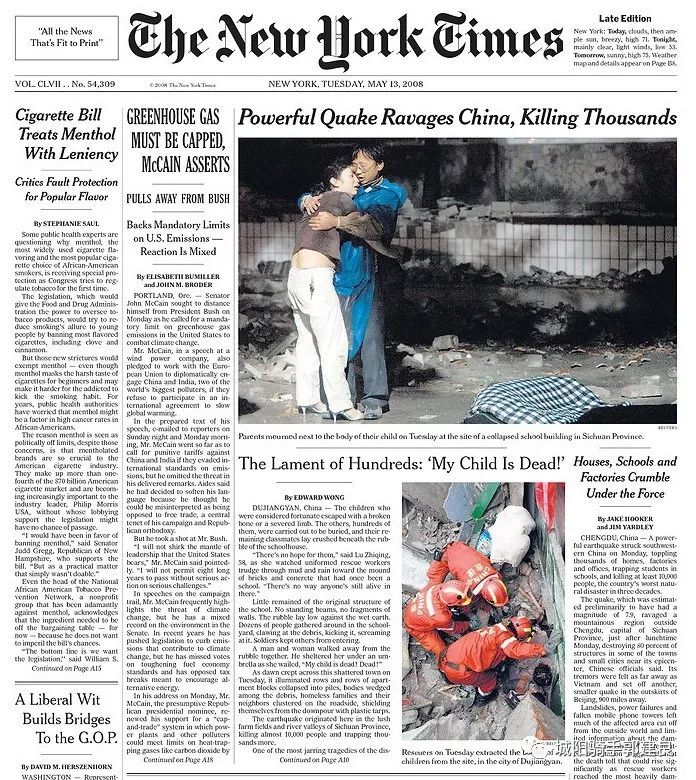 《纽约时报》连续6天头版头条都是“四川地震”,其中四天大幅照片顶格使用。以这种力度报道美国以外一场天灾,在《纽约时报》历史上十分罕见。