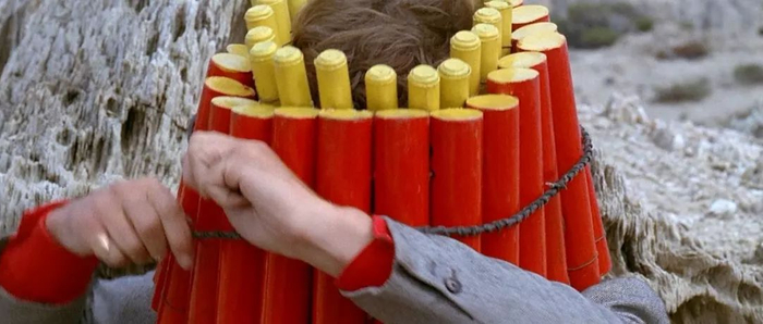 费迪南把自己被油漆涂蓝的脸,包裹在黄色和红色的炸药中,这具被三原色覆盖的身躯,马上就要被炸成碎片。自杀这件事在戈达尔看来,无疑是浪漫至极的。