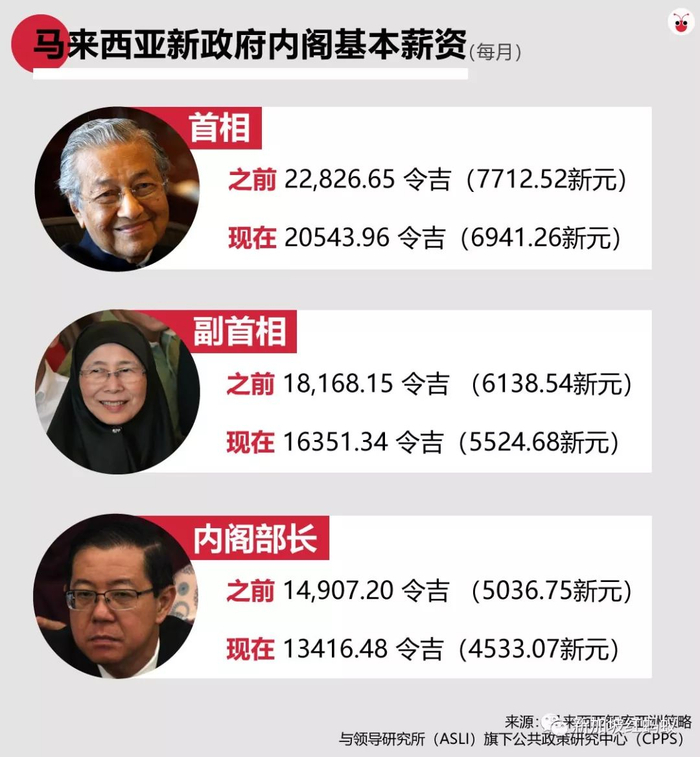 折合成新元,马哈迪降薪后的每月基本工资不到7000元,副首相旺阿兹莎刚刚超过5000元,一众内阁部长约4531元。
