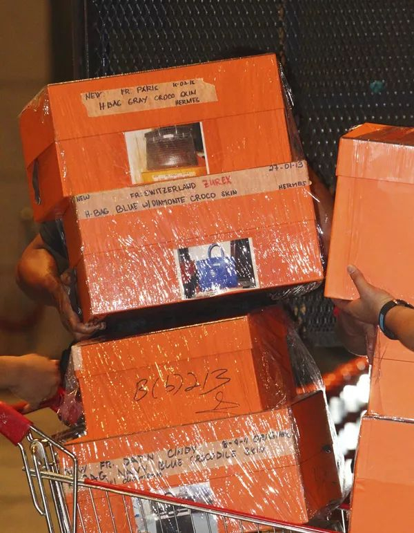284箱名牌包中包含多个装有爱马仕柏金包的橙色箱子。纳吉布的夫人罗斯玛对爱马仕柏金包的喜爱,在马来西亚广为人知。据了解,每个爱马仕柏金包的价格介于1.2万美元(约人民币7.64万元)至30万美元(约人民币191万元)之间。