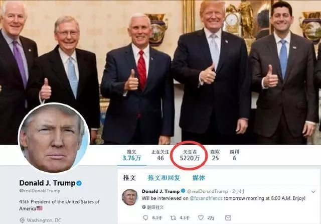 特朗普是一个狂热的推特用户,他经常在一天之内用他的帖子制造新闻。他拥有超过5220万的推特粉丝,自2009年3月注册推特以来,他在推特上发了超过37600次的推文。