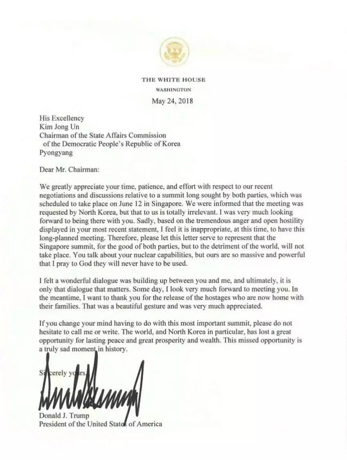 24日,朝鲜在国际记者团的见证下废弃丰溪里核试验场后不久,特朗普公开致信金正恩,告知取消原定6月12日与对方在新加坡的会晤,归咎于朝方近期表现出“极大怒气和公开敌意”。