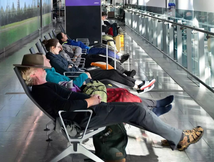 有时候累了,还有人会躺在候机室的长椅上睡觉。