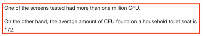 震惊的发现,其中一台自助值机屏上的每平米菌落数就超过了100万CFU。