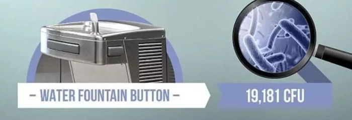 出人意料的是,竟然是喷泉式饮水器的按钮,它每平方的菌落数高达19,181CFU。