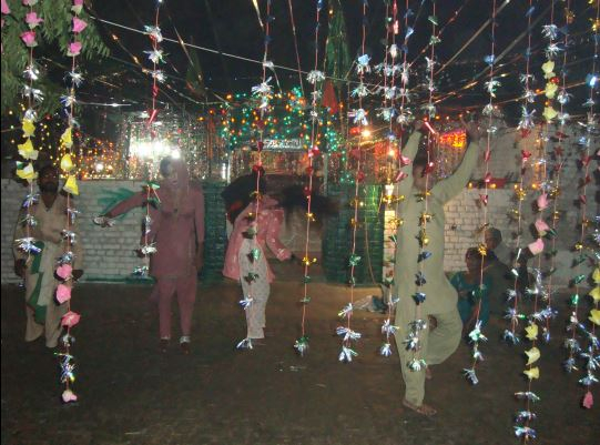 大家一个挨一个,想着法儿从中间挤过去。地上散落着十卢比的小钱,隔一会儿看场子的人就会去捡一轮。有几十个这样的场子竞相放着歌儿,都想把对方的声势盖过去。