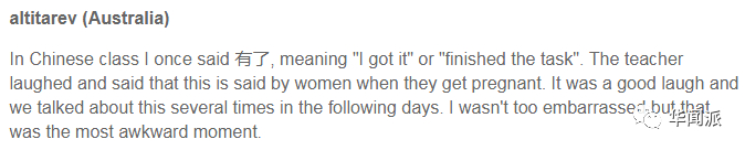 一位澳大利亚的汉语学习者说:“在汉语学习课上,我说:‘’我有了’。我本来是想说‘我知道了’,或是‘我完成了这个任务’。但老师说,‘我有了’意思是女性说自己怀孕了。”
