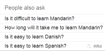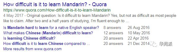 如果你认为华闻君找的关键词导向性太强,那我们不妨以“学习汉语简单”(learn Mandarin easy)为关键词再进行一次搜索,就会发现,被汉语学习吓得“瑟瑟发抖”的老外们只是换了一种问法:“学习汉语难吗?”“学习汉语需要多久?”