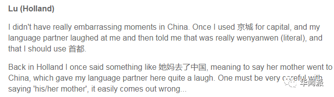 一位荷兰的汉语学习者说:“我有一次说:她妈去了中国。但我的中国语伴突然放声大笑,然后告诉我:你在指称一个人的妈妈说,一定要小心,因为意思很容易奔向一个错误的方向……”