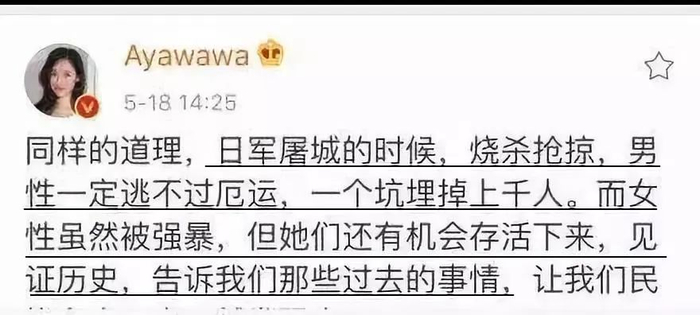 前段时间网红Ayawawa因为“慰安妇”话题,被封号了。