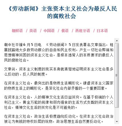 《劳动新闻》5日发表署名文章,批评资本主义。分析人士称,在外界猜测朝鲜可能走向经济改革时,这篇文章或许透露了朝鲜的立场。