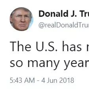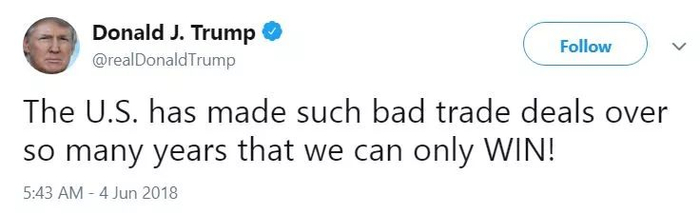 特朗普6月4日的推特:那么多年下来,美国一直做那么糟糕的贸易交易,这次我们只有赢!
