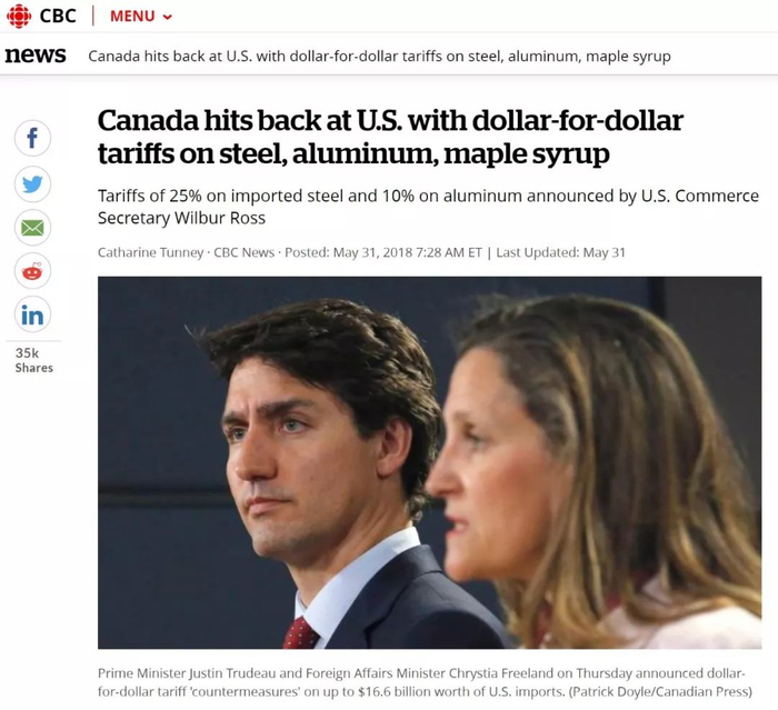 欧盟和加拿大迅速对美国发动的贸易战做出强烈反弹。就在美国商务部长威尔伯·罗斯确认执行特朗普总统的命令几个小时后,加拿大总理贾斯汀·特鲁多和外交部长方慧兰(Chrystia Freeland)开记者招待会宣布了一项他们称之为“第二次世界大战以后加拿大对外最严重的贸易制裁行动”——对美国价值166亿美元的进口商品加收报复性关税,并在7月1日正式生效。贸易战在美国和加拿大这个邻居间一触即发。