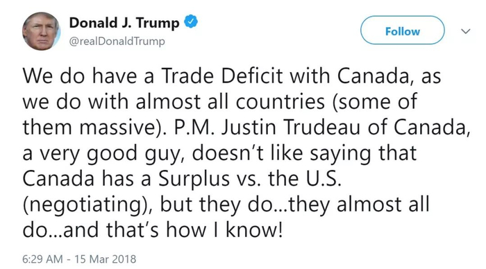 特朗普发推:指责加拿大对我们是贸易顺差,虽然特鲁多总理不同意,但我知道的,他们就是对我们顺差。