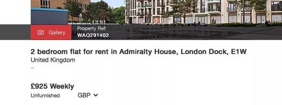 而就东伦敦来看,金融城旁中国大使馆新址所在地沃平地区的租金十分可观,目前新房(以伦敦港项目为例)一居室每周租金达到了600英镑,二居室高达850英镑每周。