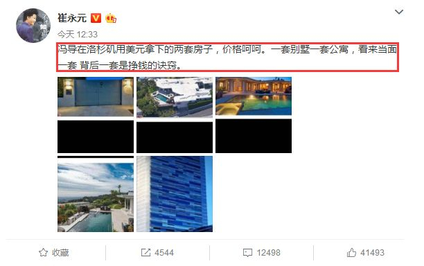 今天凌晨(美东时间)崔永元发帖暗讽冯小刚玩阴阳合同,在洛杉矶用美元拿下两套房子,正是当面一套背后一套的挣钱。