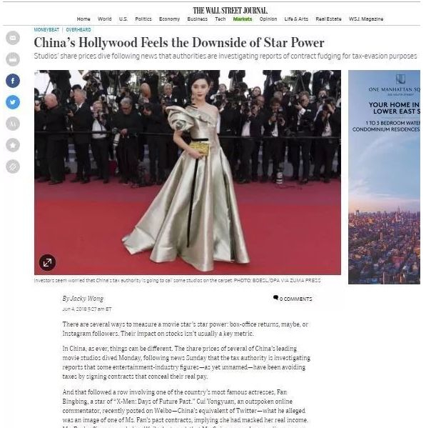4日上午5点27分,《华尔街日报》发表了一篇名为《中国好莱坞感受到了明星魅力的负面效应》(China‘s Hollywood Feels the Downside of Star Power)。