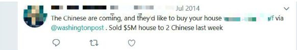 这座房子的经纪人在2014年成交了这幢房产后曾在社交媒体上写道:"中国人来了!而且他们还喜欢购买你们的房子。本周刚刚与两名中国人500万交易了一处房子!并@了华盛顿邮报。"