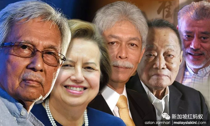 国家元老精英委员会的成员包括前财长达因(左一)、国家银行前总裁洁蒂(左二)、马来西亚首富郭鹤年(右二)、国家石油公司前总裁哈山马力肯(中)及经济学家佐摩(右一)。(当今大马)