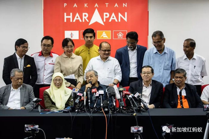 马来西亚首相马哈迪(前排中)在5月12日宣布了四名重要内阁部长人选,分别是公正党主席旺阿兹莎(前排左二)出任副首相、民行党秘书长林冠英(前排右二)任财政部长、国家诚信党主席莫哈末沙布(前排右一)任国防部长和土著团结党主席慕尤丁(前排左一)任内政部长。图为马哈迪在5月17日率四位内阁部长出席一场记者会。(彭博社)