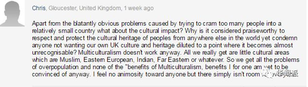有一位英国网友也谈到了移民对英国的文化冲击:“移民就是试图把太多的人,塞进一个相对较小的国家,带来了显而易见的问题之外,他们对文化影响又如何呢?我们为什么要尊重和保护世界上其他地方的文化遗产,却要谴责那些不希望英国文化和遗产被其他文化‘稀释’的人?多元文化主义是行不通的……”