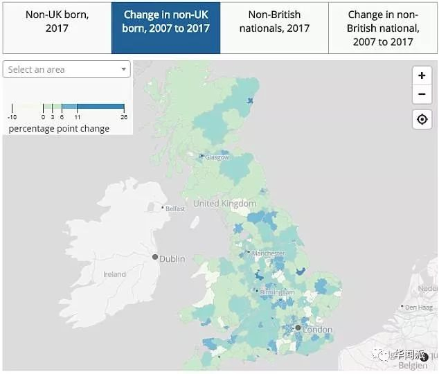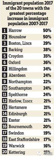 根据英国国家统计局的数据,2007年至2017年的这十年间,英国有20个区的移民人口增长率超过了15%。作为全球首屈一指的大都市,伦敦更是有着庞大的移民数量,其中最高的两个区都是属于伦敦,其增长率竟然高达50%。