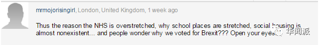 对于外来移民的增多,这位网友是这么说的:“(移民增多导致)NHS开支庞大,学校学位紧张,社会住房供不应求……人们想知道为什么我们投票支持英国‘脱欧’?睁开你的眼睛! ! !”
