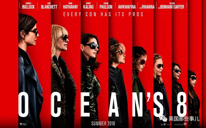 电影主演阵容豪华,包括了凯特·布兰切特、安妮·海瑟薇、蕾哈娜、桑德拉·波洛克等大明星: