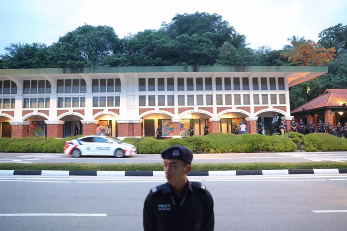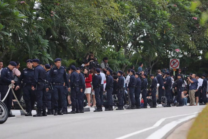 当地时间8:11分,美国总统特朗普车队抵达圣淘沙岛上的嘉佩乐酒店。新京报记者陶冉 摄于会场外