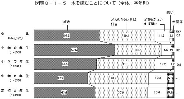 该法的实施,为促进日本青少年儿童的读书活动起到了非常积极的效果。据日本文部省2004年调查显示,就是否喜欢读书这一问题,日本的儿童及学生回答喜欢或比较喜欢的占全体的8成以上,达到85.6%。对于喜欢的理由,也有82.6%的人回答,因为非常有趣,很开心;而关于读书的地点,在自己家中读书的占82.7%,每个月的阅读册数,4~6册的占达17.4最多,0册的只有11.4%。