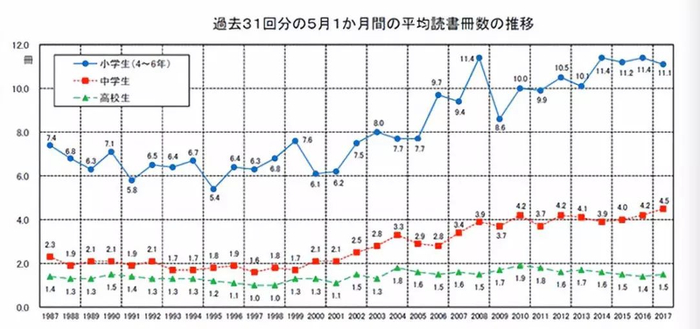 从去年的调查结果来看,日本小学生一个月的阅读量高达11.1册,中学生为4.5册,高中生为1.5册。从连续31年的调查结果来看,小学生的阅读量持续增加,中学生的阅读量也在进入新世纪后缓慢增加,而高中生的阅读量基本持平。