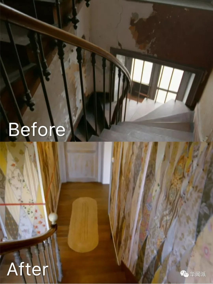 女主人安吉尔则负责轻体力活与空间设计。 她仍能清晰地回忆起自己是如何一步一步改造下图中复古楼梯的:“我把自己选择的复制品壁纸图案印刷到了菱形织物片上,然后把海绵盖在墙上,并使用钉枪来形成缓冲效果,还在对比织物之间的每个对角线交叉处钉上了黄铜钉。这些设计,都打上了我自己的烙印。”
