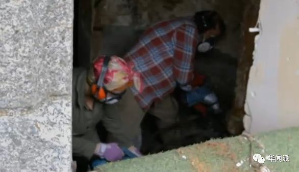 两人一起带着面罩,挥着锤子凿开墙壁。