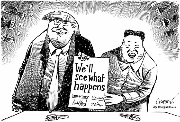 彭博社报导,这次历史性峰会取得成功的无疑是金正恩,他以核战威胁美国赢得了跟美国总统川普的双边会谈,达成金氏政权的长期战略目标,而美国在这场峰会中则未获得回报。 在川金两人的联合声明中,完全未见到美方所要求的完全、可验证、不可逆转的无核化(CVID)字眼,同时也缺少了诸如弃核时间表,验证程序甚至是无核化的定义。 报道指出,川普掉入了他批评前几任美国总统所陷入的相同陷阱中,亦即给予朝鲜太多却未得到任何回报。