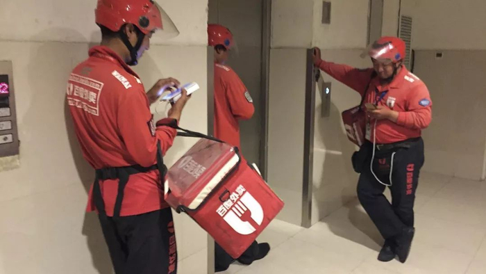 与顾客快速交货后,他火速冲下20层楼梯。送完了一单,还有六单。