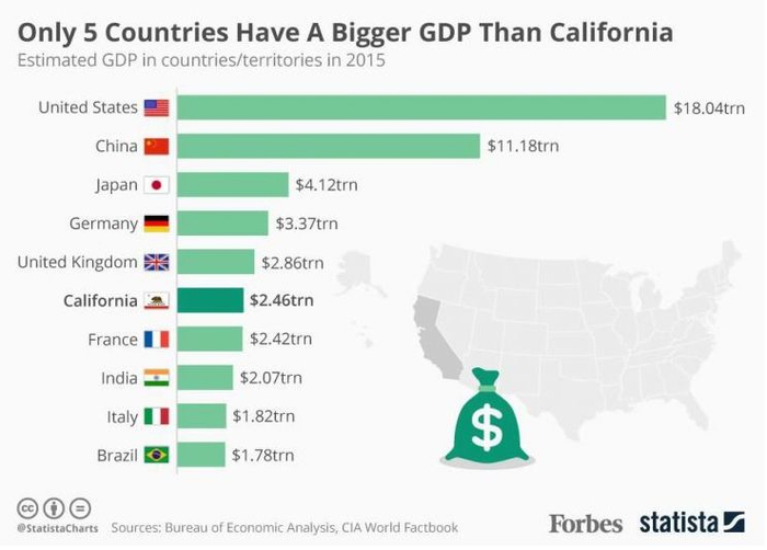 据最新联邦数据,加州的经济已经超过了英国,成为世界第五大经济体,生产总值从2016年到2017年增加了1270亿美元,超过2.7万亿美元,真正做到“富可敌国”。