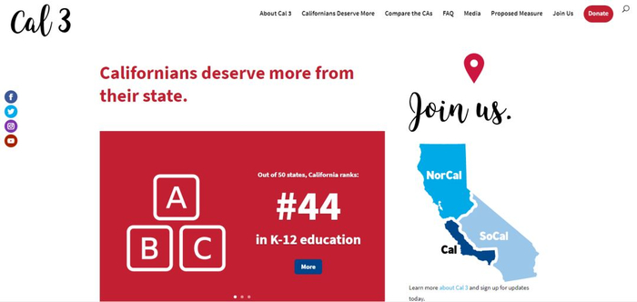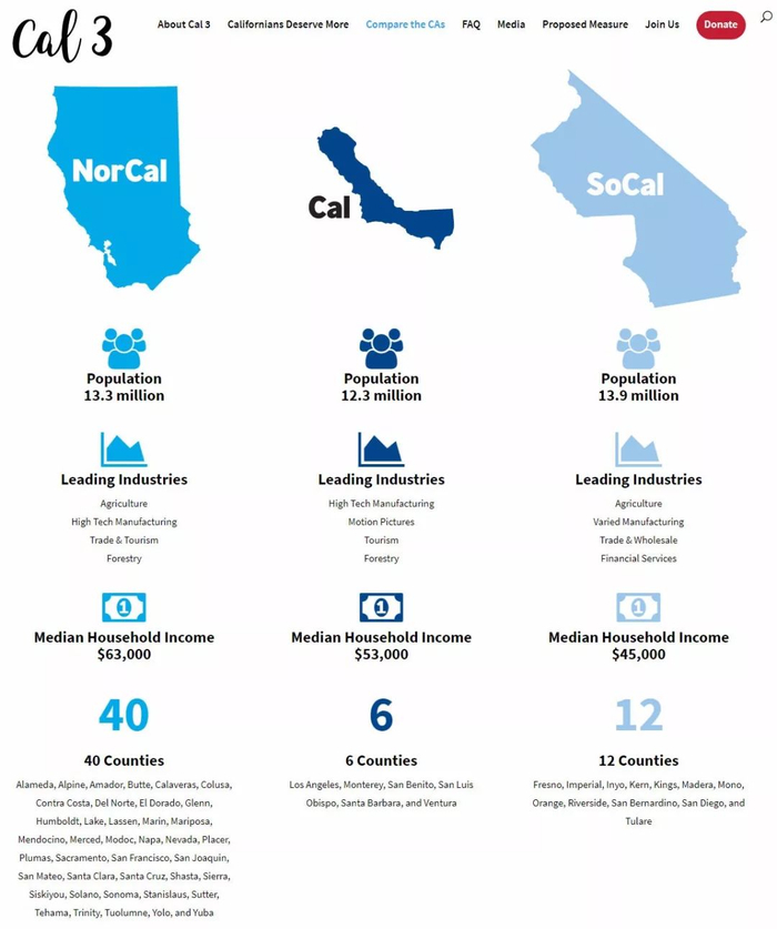 根据Cal 3网站,现在的加利福尼亚州将将被分成三个州:加利福尼亚州,北加利福尼亚州和南加利福尼亚州;每个州将有大约1230万至1390万人。