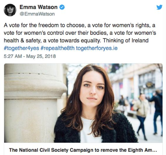 爱尔兰事件也与世界范围内的“Me too”运动相关联,所以废除反堕胎法的支持者们不仅仅存在于爱尔兰本国内,包括女权倡导者Eamma Watson、前单向乐队的歌手Niall Horan、Russell Crowe、Chelsea Handler和Courtney Cox等在内的众多明星都明确表达了对废除反堕胎法的支持。