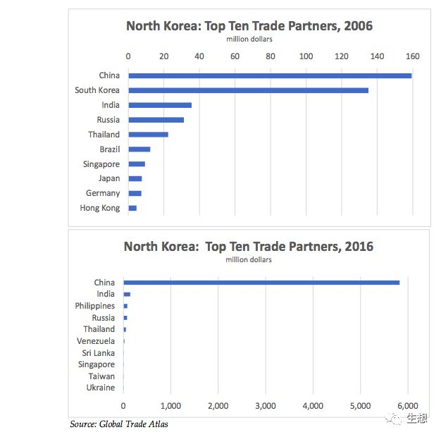 (全球贸易数据库:2006年朝鲜的十大贸易伙伴依次是中国、韩国、印度、俄罗斯、泰国、巴西、新加坡、日本、德国和香港;2016年朝鲜的五大贸易伙伴依次是中国、印度、菲律宾、俄罗斯和泰国)