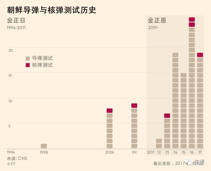 2017年1月,金正恩号称朝鲜已经在试验洲际弹道导弹的最后阶段,如果成功,这导弹就可以威胁到美国的安全,特朗普一如既往地直接用社交媒体推特回复:“这不可能发生!”。同年3月,朝鲜就发射了4枚弹道导弹,其中3枚落到日本的专属经济区,此时,作为盟友的美国政府已经有点坐不住了。接着到了7月的美国独立日,朝鲜试射了新型的“火星-14”洲际弹道导弹,专家分析射程可达到美国的阿拉斯加或夏威夷。作为反击,9月,美国完成了在韩国萨德反导弹系统的部署,这期间引发了中国的强烈不满,乐天玛特超市也因此躺枪,112家在华门店截至8月有87家暂停营业,业绩惨淡。11月底,朝鲜试射了威力更大的“火星-15”洲际弹道导弹,金正恩宣称他的武器项目已经完成,射程几乎覆盖全美国,再次给美国政府施压。