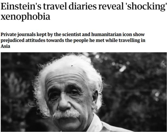 其中,英国《卫报》在其报道中还进一步指出,爱因斯坦不仅对中国人有疑似“种族歧视”的看法,还对日本和印度人也有着疑似“人种”上的歧视,比如认为中国、日本和印度人在智力上都有着天然的不足……
