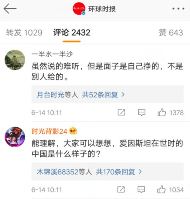 其中,不少中国网民的看法是,当时的中国和中国人恐怕给外国人的印象就是这样的。更何况鲁迅先生在爱因斯坦来到中国4年前(即1918年)发表的《狂人日记》中也深入地讽刺和批判了当时中国社会和中国人令人绝望的精神面貌,并揭示了封建礼教对中国人思想的荼毒。