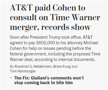 这件事情还出了一个有意思的小插曲。5月份,美国媒体曝光了川普的律师麦克·科恩收钱办事的破事儿。这哥们开了一家皮包公司,以“我办事,你放心”为名义收大企业的钱。AT&T赫然在列,给了60万美元。结合其司法部和他们家的并购案官司,这60万美元激发了人们很多猜想。