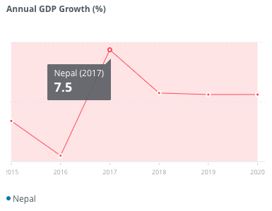 21世纪以来,尼泊尔国内政局接连面对内战、政权更迭等挑战。随着2015年新联邦宪法的颁布, 以及2017年民主选举的进行,尼泊尔的政治转型就此基本完成,社会环境趋于稳定。世界银行数据显示,尼泊尔在2017年GDP增长为7.5%,远远高于前一年因政治动荡和印度“软封锁”造成的低增长(0.4%)。