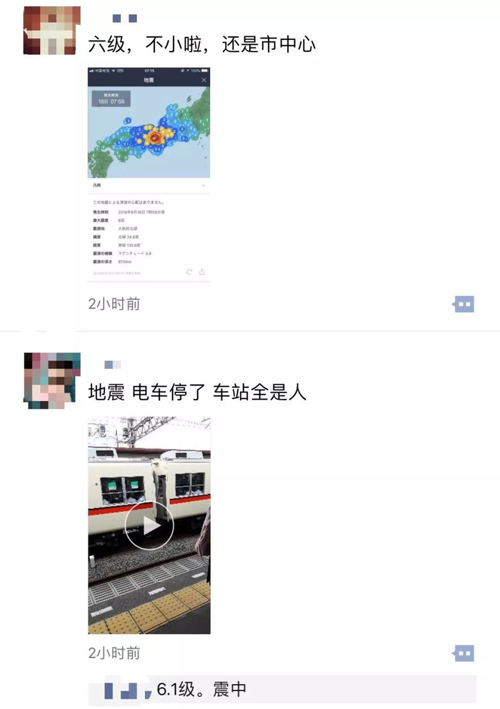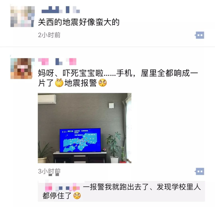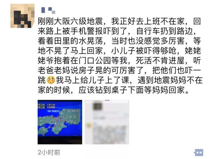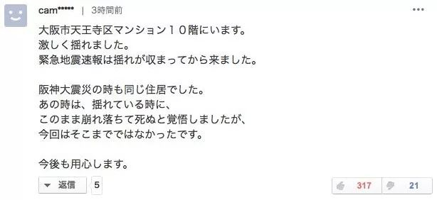 “地震发生时我在大阪的天王寺区10楼的公寓里。摇的非常激烈。紧急地震速报是在摇到差不多了的时候才收到。