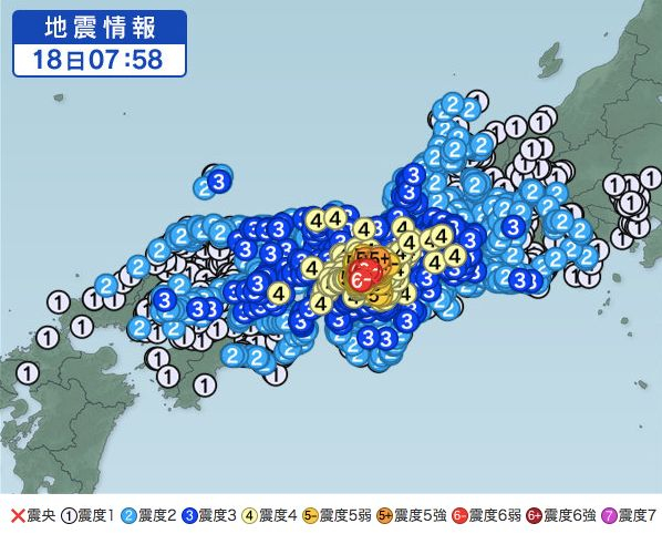 地震造成了关西部分地区停电、新干线停运。截止目前,确认已造成三人死亡,包括一名9岁的女童和两位老人(分别为80岁和84岁)。