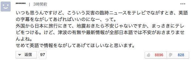 “每次遇到地震都觉得,灾害突发的新闻在电视上显示时候应该附上英文字幕。从外国来日本的游客们,遇到地震肯定非常害怕和不安,需要靠电视获取情报。然而现在包括是否有海啸等最新情报,全部都是日语的,至少应该更新个英语情报给他们吧。”