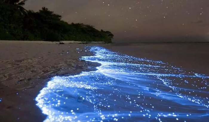 当夜晚降临,海岸线上会闪闪发着蓝色的光,使沙滩看上去像是漫天星斗的天空。这是大海里的浮游生物像萤火虫一样发出的荧光,如果踩上去,还会留下发光的脚印。