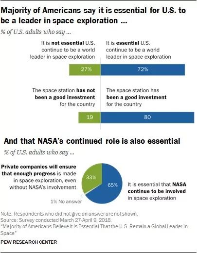 2018年6月6日,皮尤中心公布的一项民调显示,大多数美国人认为美国应该在太空探索方面处于全球领先地位。他们认为,国际空间站的建设是很好的投资。此外,受访者还表示,尽管私人太空公司的重要性日益提高,但美国太空总署(NASA)对于美国太空探索的未来仍然十分重要。