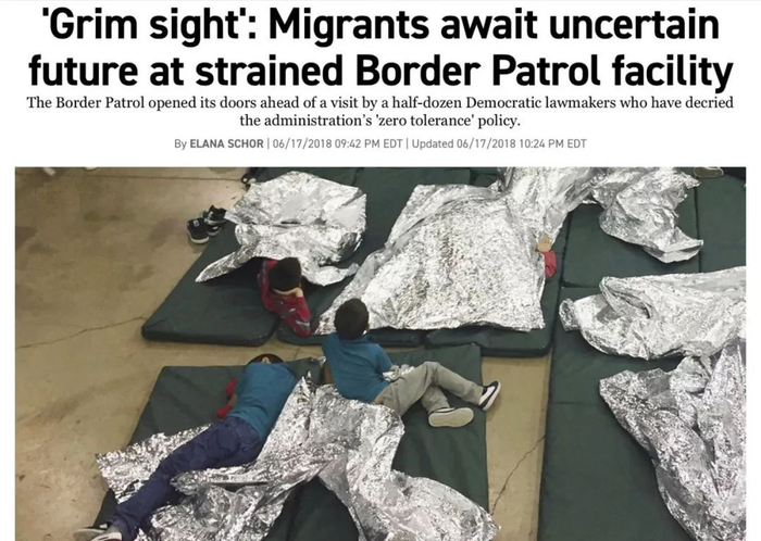 “在一家美国边境的巡逻机构内,1100多名未成年移民子女坐在政府发放的绿色床垫上,身上裹着迈拉床单(一种聚酯类高分子物的商品),他们全然不知自己将要面临的是怎样的未来,能做的只有等待。随着特朗普‘零容忍’移民政策的推行,得克萨斯当地的各种应急资源也变得紧缺。”